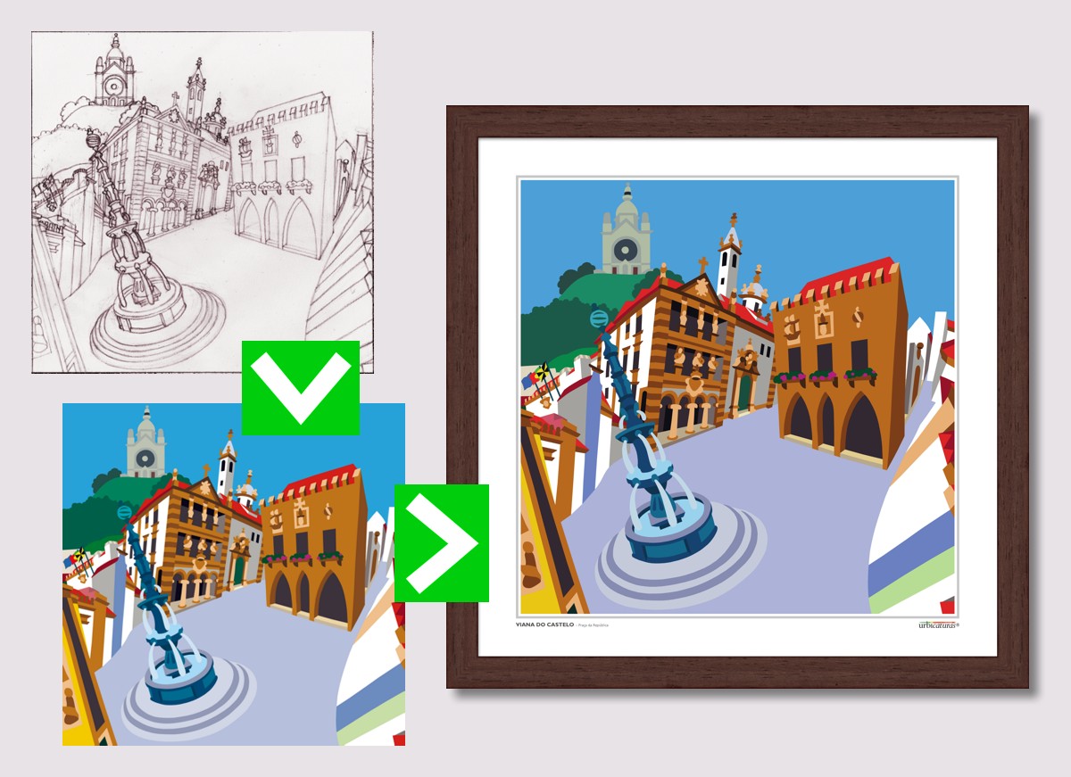 Desenhos feitos à mão e pintados digitalmente, são depois impressos em cartão compacto, envernizados e montados em molduras de madeira. Com traço de caricatura e animadas por cores vivas, as Urbicaturas alegram os espaços que decoram, e como têm molduras disponíveis em várias cores, adaptam-se a diferentes estilos decorativos.
